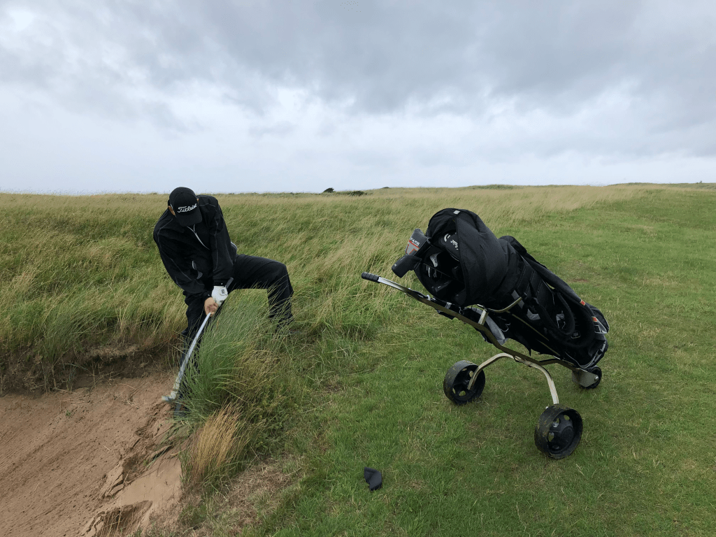 The wind was brutal, but it didn’t get in the way of a great time. And, on those rare times when one hit a shot without spin, the wind actually didn’t get in the way too often. Turnberry also featured some of the most brutal rough we saw in Scotland. Here’s AC trying to hit out of the rough that is ON TOP of a fairway bunker, somewhere on the front nine: