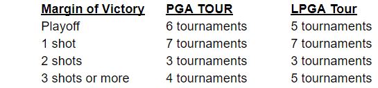 If you watch the PGA Tour because of the exciting finishes almost every week, you should be watching the LPGA Tour. I looked at the margin of victory for the last 20 events on both tours, and here were the results: