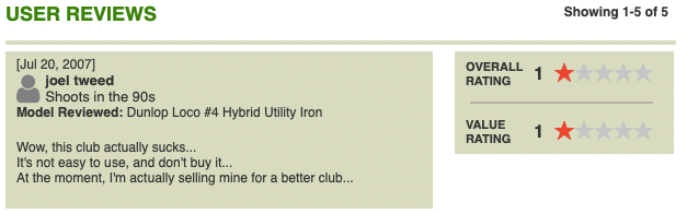 These are but a small sampling of the wonderful bargains I was able to uncover. I encourage you to troll as I do and participate in this vibrant buying and selling scene. You may just find yourself a short drive away from Weedsport to score yourself a $5 set of LoCo brand Gulf Clubs. Just don’t listen to 30+ handicapper Joel Tweed on GolfReview.com who gave the Dunlop LoCo Hybrid just one star and described it as “actually sucking.”